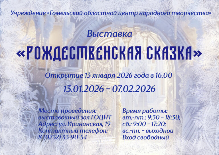 Учреждение «Гомельский областной центр народного творчества» приглашает! 13 января 2026 года в 16:00 в выставочном зале учреждения Новый год встречает тематическая выставка «Рождественская сказка»