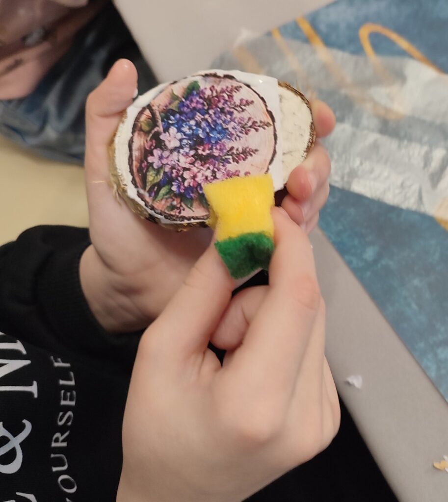 В уютной творческой атмосфере 14 февраля в выставочном зале учреждения «Гомельский областной центр народного творчества» прошел мастер-класс по изготовлению сувенира «Магнит на спиле дерева» в технике декупаж.