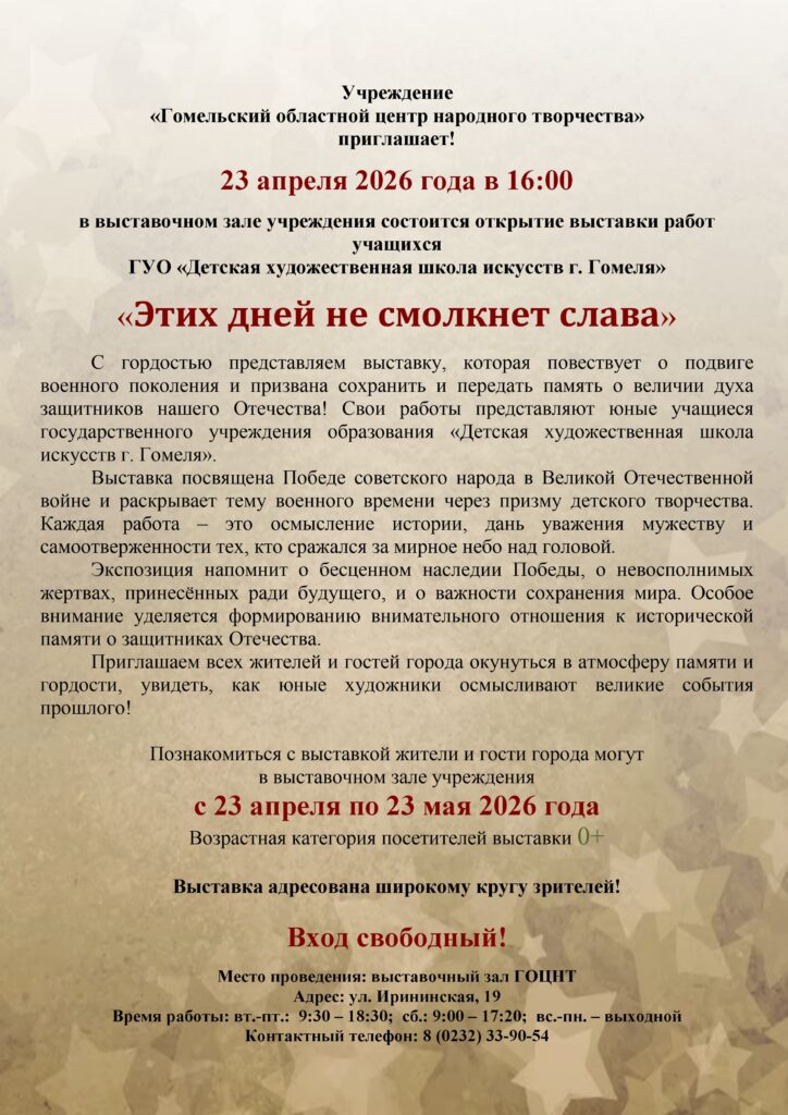 23 апреля 2026 года в 16:00 в выставочном зале учреждения состоится открытие выставки работ учащихся «Этих дней не смолкнет слава»